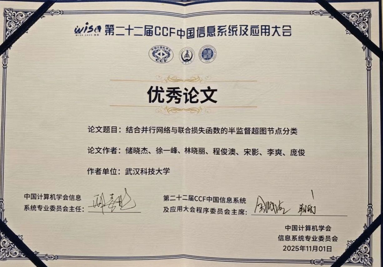 硕士研究生储晓杰、徐一峰、程俊澳、宋影、李爽在庞俊和林晓丽两位老师的指导下合作的论文《结合并行网络与联合损失函数的半监督超图节点分类》,荣获WISA 2025优秀论文。大会共收到研究论文投稿202篇,录用英文论文51篇,录用中文论文57篇。最终评选出1篇最佳论文,1篇最佳学生论文,6篇优秀论文。