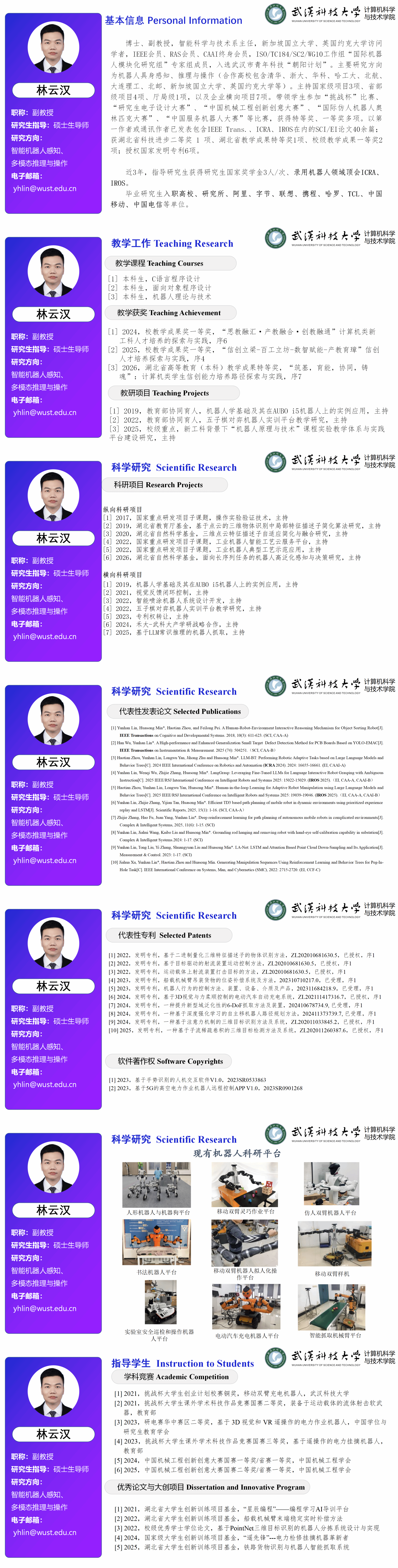 主要研究内容包含:1. 面向非结构化环境的具身场景理解,融合时空图神经网络、知识图谱与视觉语言模型构建协同认知框架;2. 基于大语言模型和高维启发式的长时动态任务规划,通过语义规划器、行为树生成与动态扩展提升鲁棒性与适应性;3. 基于扩散模型与流匹配的操作技能学习,构建连续的技能状态流,让机器人快速学习不同冶金检测任务(如材料成分检测、样品预处理等)的操作逻辑,提升技能学习的效率与鲁棒性。
