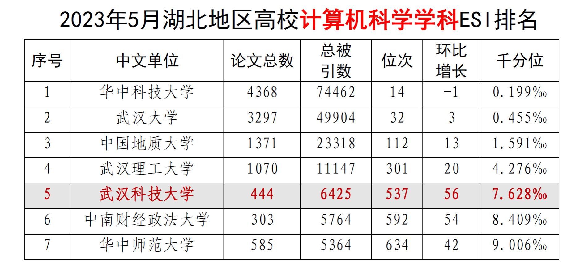 科睿唯安(Clarivate Analytics)基本科学指标数据库(Essential Science Indicators,ESI)是衡量高校科研水平的重要指标之一。2023年5月11日,科睿唯安更新了ESI数据库。最新数据显示,成人短视频 计算机科学、工程学等五个学科进入ESI全球排名前1%。其中,计算机科学学科湖北地区仅7个高校上榜,成人短视频 排名第五,学术水平和影响力明显提升。