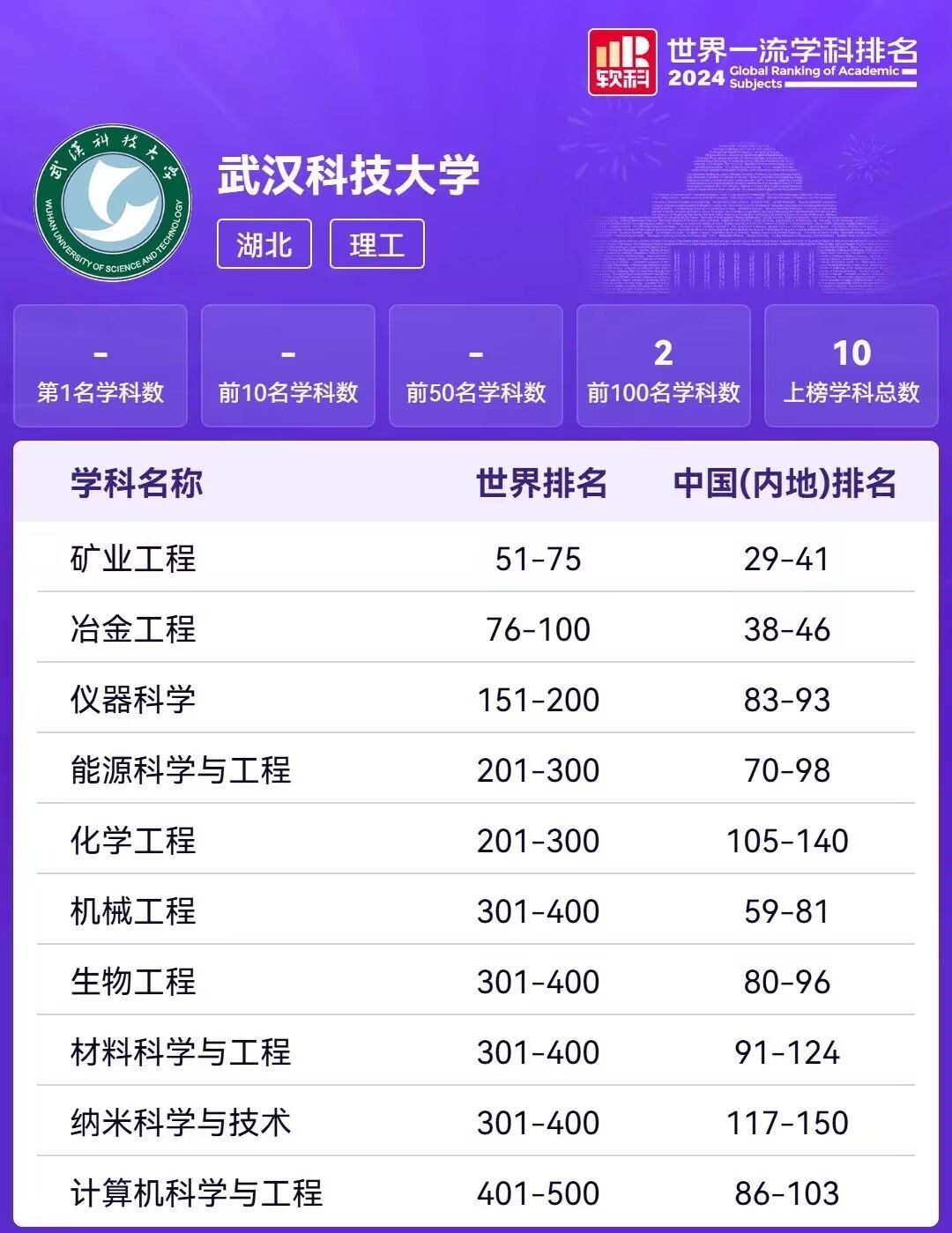 2024“软科世界一流学科排名”排名覆盖55个学科,涉及理学、工学、生命科学、医学和社会科学五大领域。此次排名的对象为全球3000余所大学,共有来自96个国家和地区的1900余所高校最终出现在各个学科的榜单上。