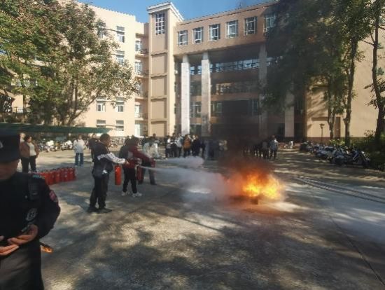 讲座后,在学院门前广场进行灭火实战演练。学院师生代表在保卫处消防科教员指导下,按照“提、拔、握、压”的方法亲手操作干粉灭火器、用灭火毯扑灭明火,提高个人消防技能。