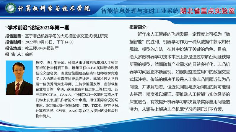主讲人简介:徐新,教授、博士生导师。长期从事计算机视觉和人工智能领域的教学科研工作。近年来获CCF-B类国际会议最佳论文提名奖、湖北省第四届高校青年教师教学竞赛奖;入选湖北省青年科技晨光计划,成人短视频