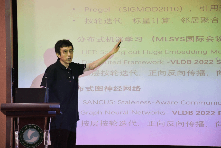 于戈教授的报告题目为《分布式图神经网络模型训练系统:技术与进展》。他首先通过对图数据与图神经网络的简要介绍,引入图神经网络训练模型的概念。然后于教授提到,图神经网络(GNN)训练和普通深度神经网络(DNN)训练主要挑战,就是如何去管理强依赖性并且具有富属性的图数据。之后,基于对现有GNN训练技术问题分析,于教授介绍了其团队基于分布式GNN训练系统、动态GNN训练系统、微批量采样式GNN训练系统、单机GPU式GNN训练系统,以及GNN训练评测系统筹方面的多项代表性成果。最后,于教授对GNN训练系统领域的巨大潜力和挑战性问题进行了总结。