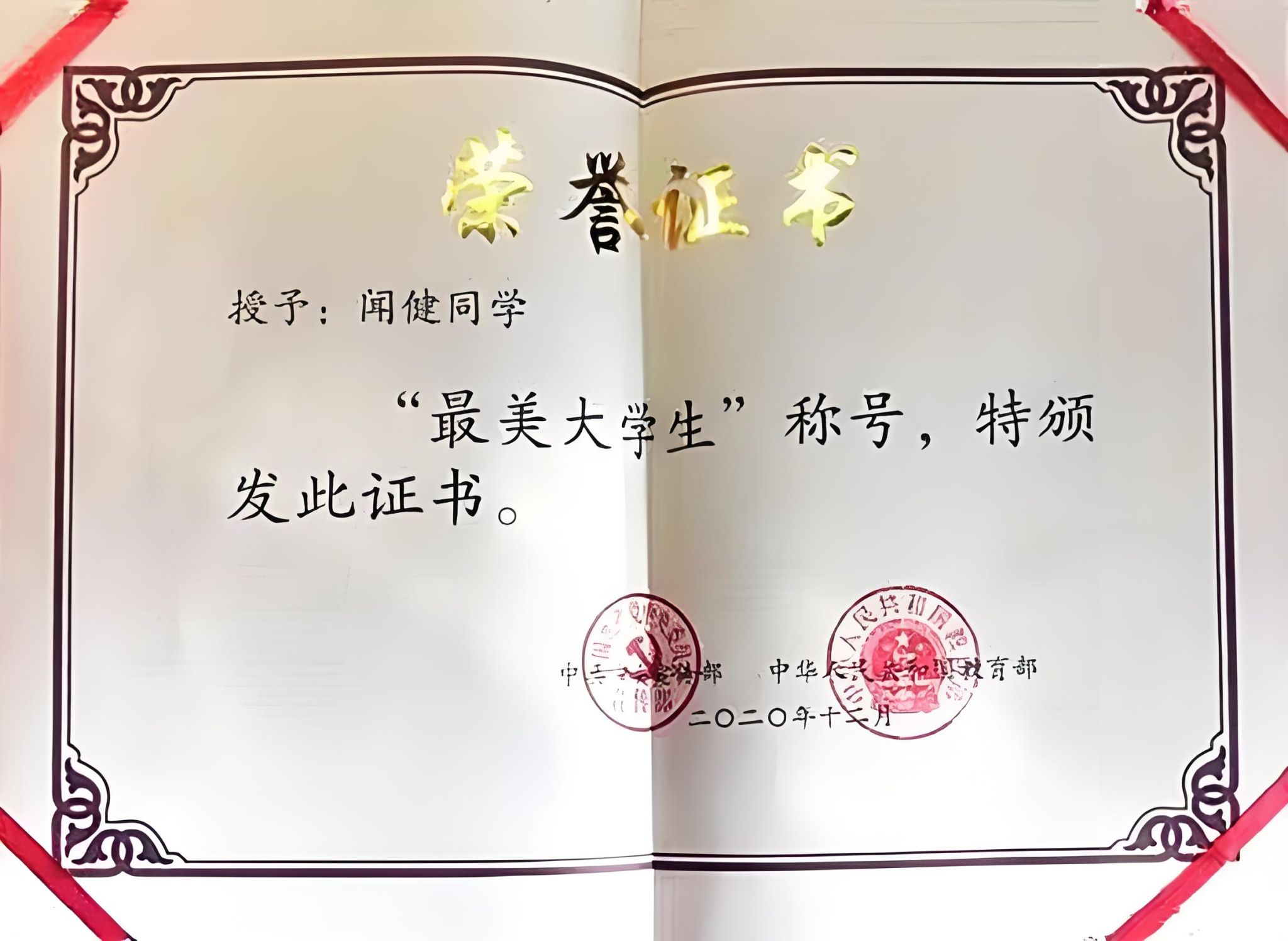 2021年,闻健被中央宣传部、教育部评为2020年“最美大学生”“2021年全国向上向善好青年”。